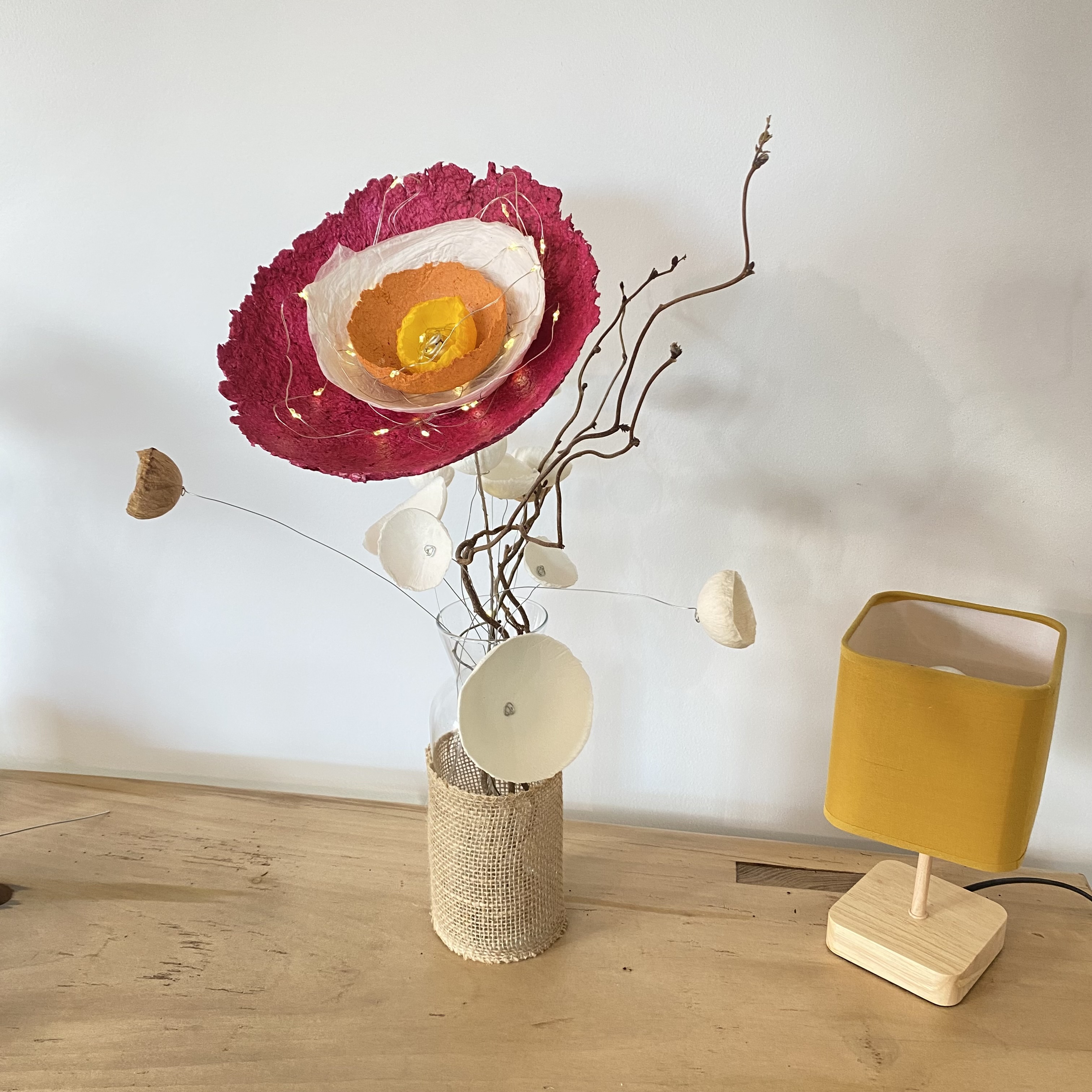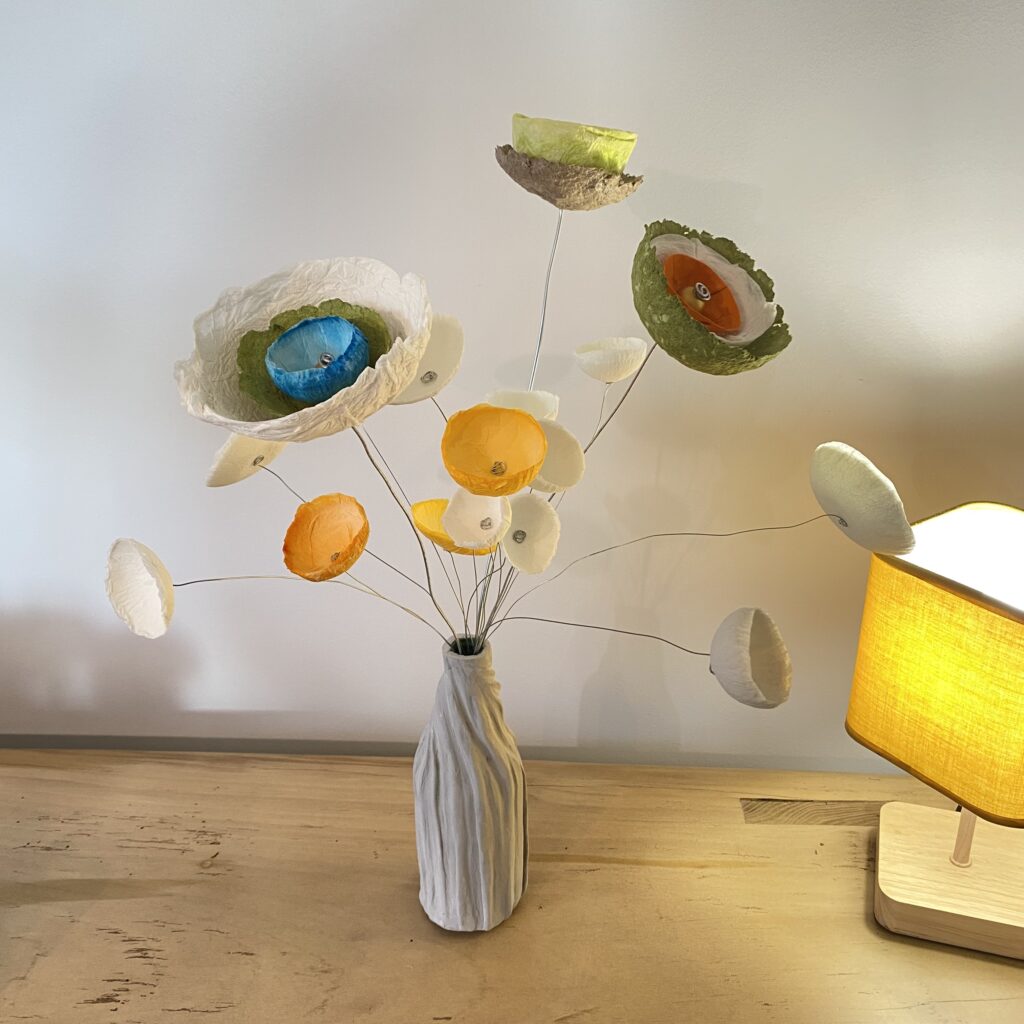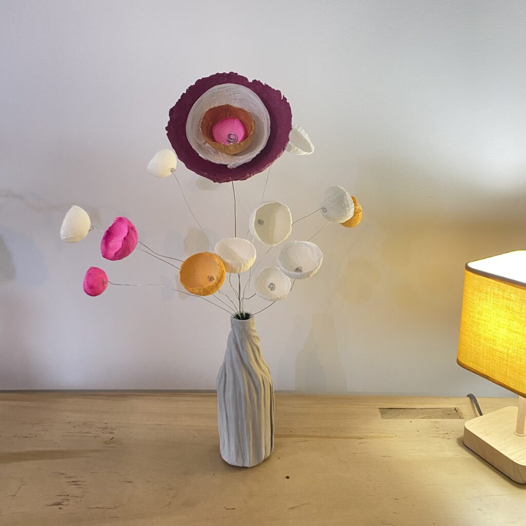 Des fleurs en papier mâché aux couleurs tendres ou chatoyantes pour embellir votre maison ou offrir. En trônant sur une longue tige de fer, chaque fleur peut être utiliser selon vos envies : en bouquet, s’entortillant sur un vase ou une carafe pour les sublimer, s’accrocher dans un luminaire ou des rideaux, apporter une touche de couleurs dans une plantes,…