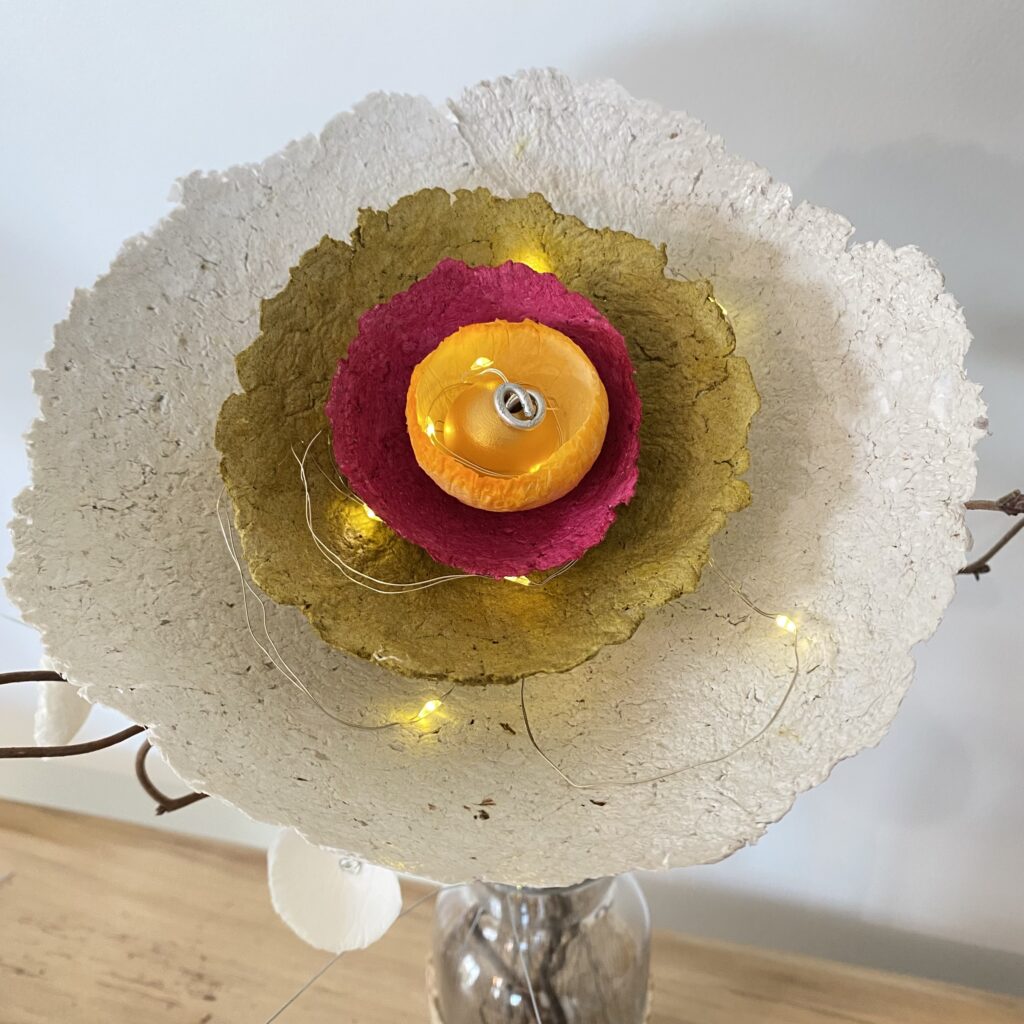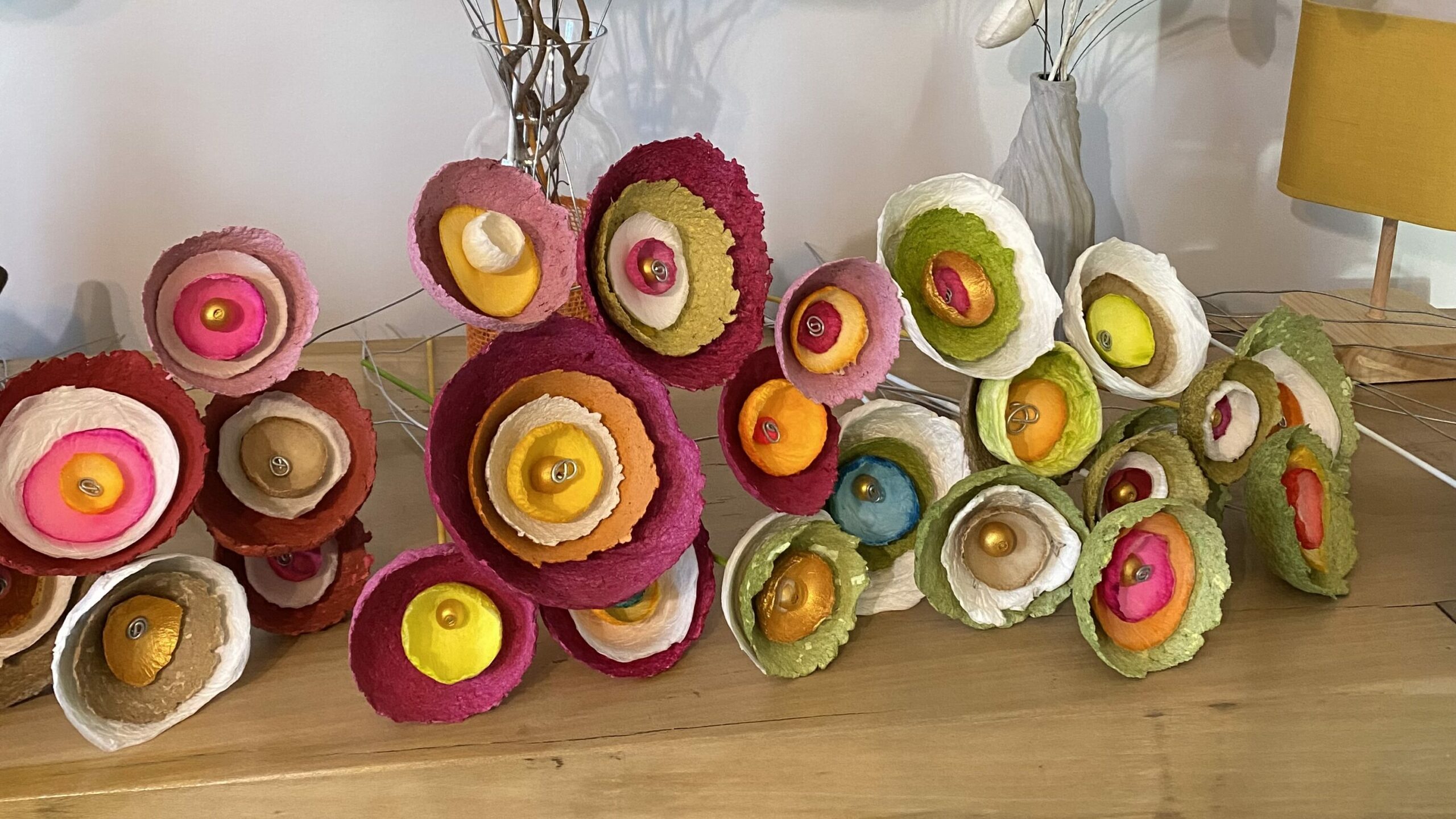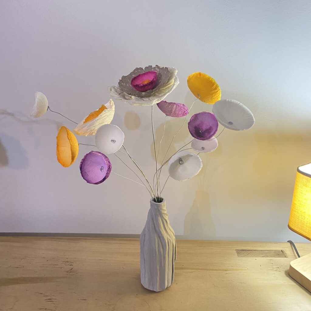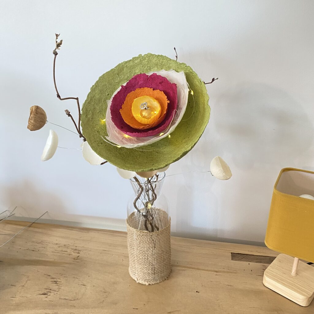 Des fleurs en papier mâché aux couleurs tendres ou chatoyantes pour embellir votre maison ou offrir. En trônant sur une longue tige de fer, chaque fleur peut être utiliser selon vos envies : en bouquet, s’entortillant sur un vase ou une carafe pour les sublimer, s’accrocher dans un luminaire ou des rideaux, apporter une touche de couleurs dans une plantes,…