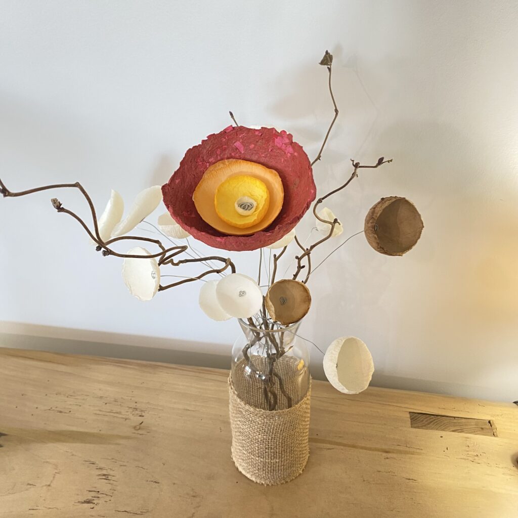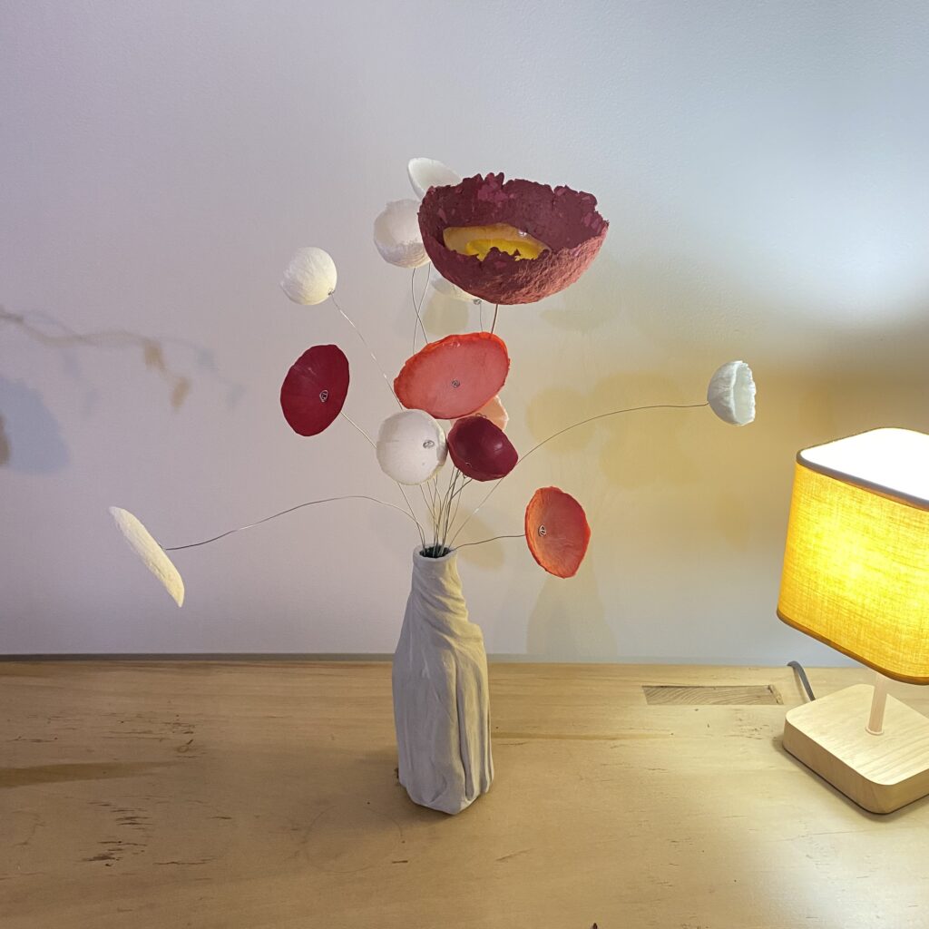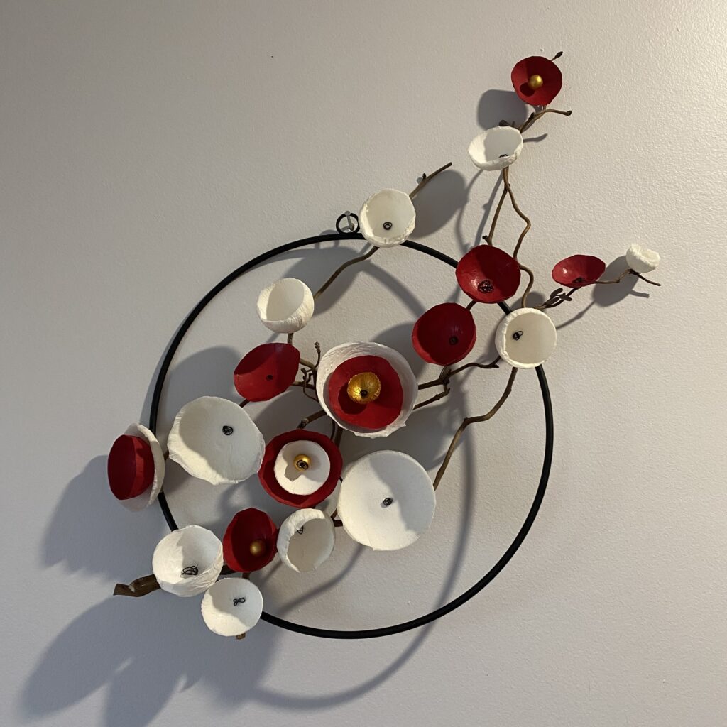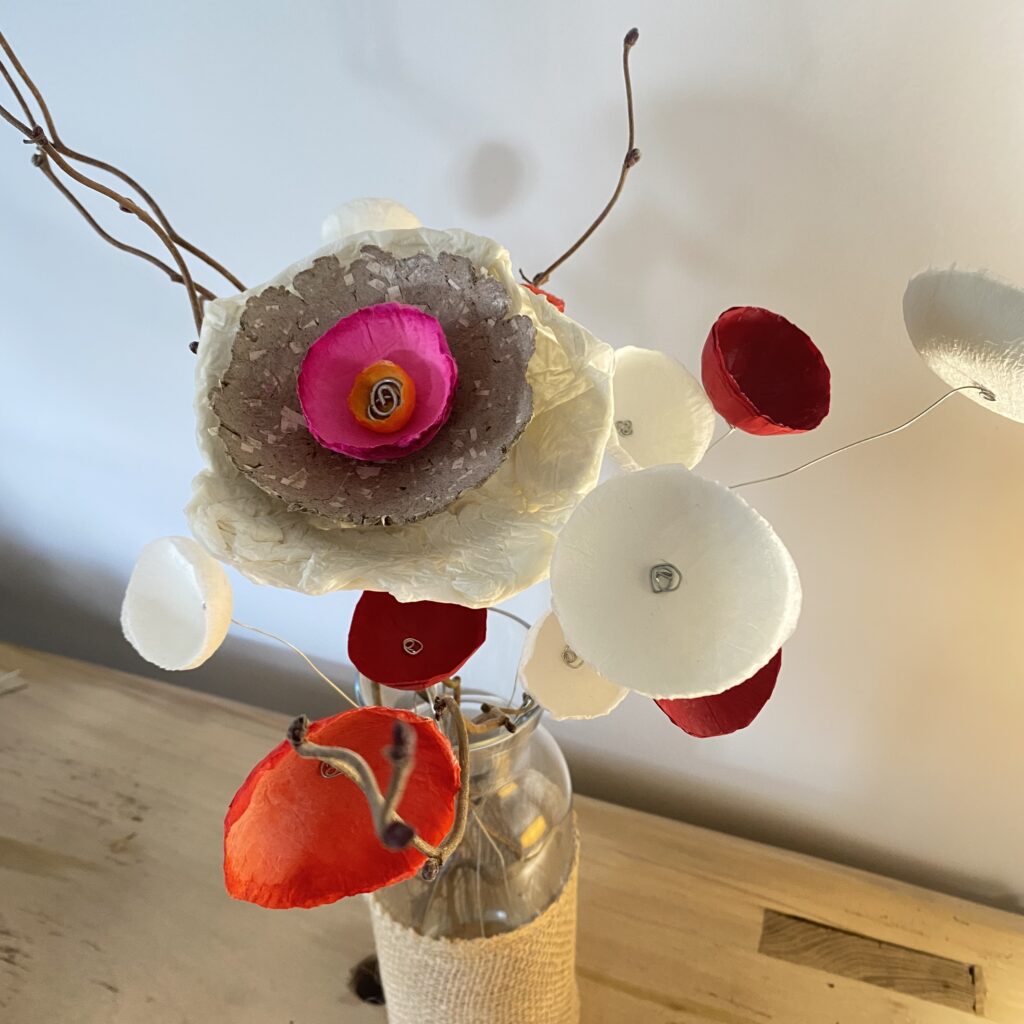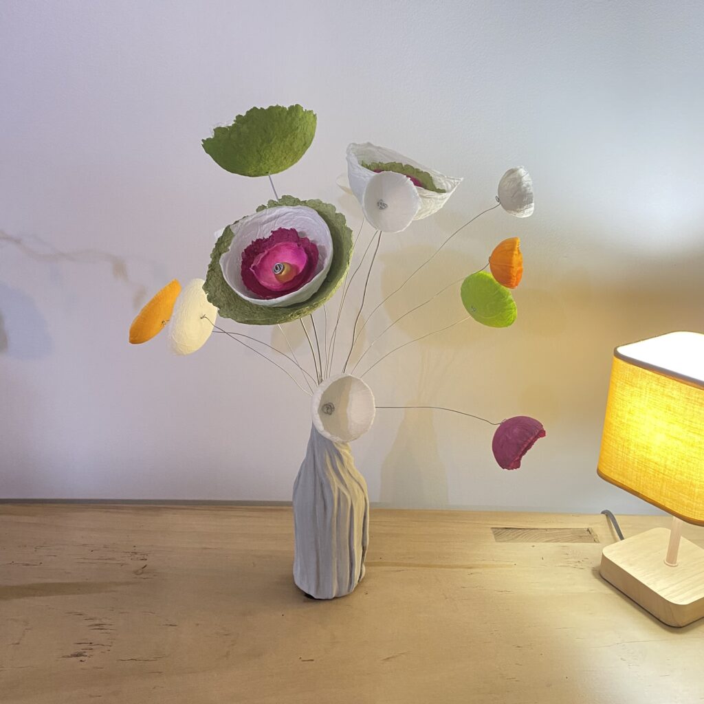 La transformation de la matière me fait vibrée et de cette énergie rayonnante est née la série des Cœurs et bouquets de fleurs. Création en papier mâché et fil de fer. Chaque cœur est unique ainsi que les fleurs faites à la main.