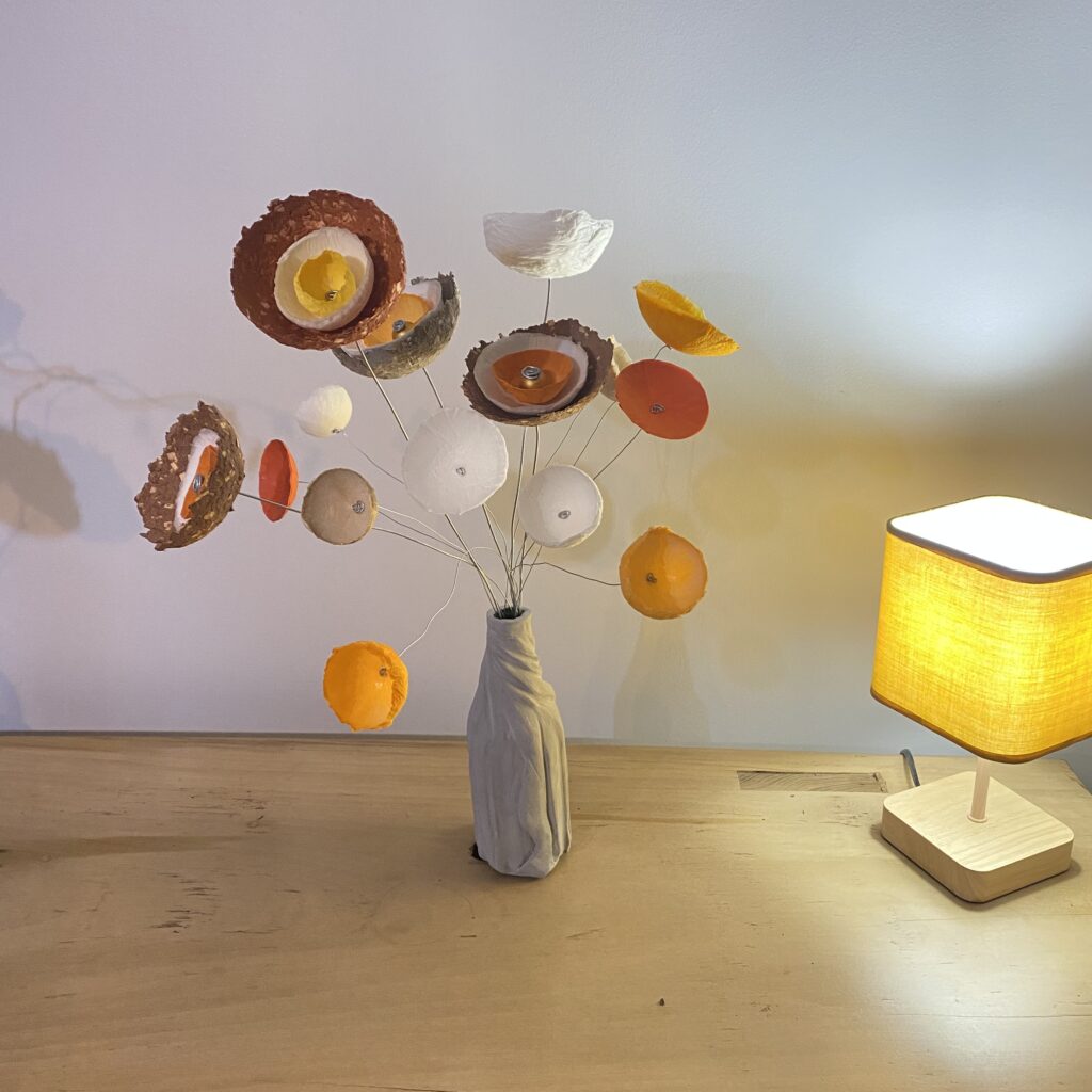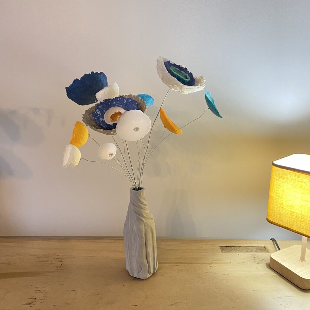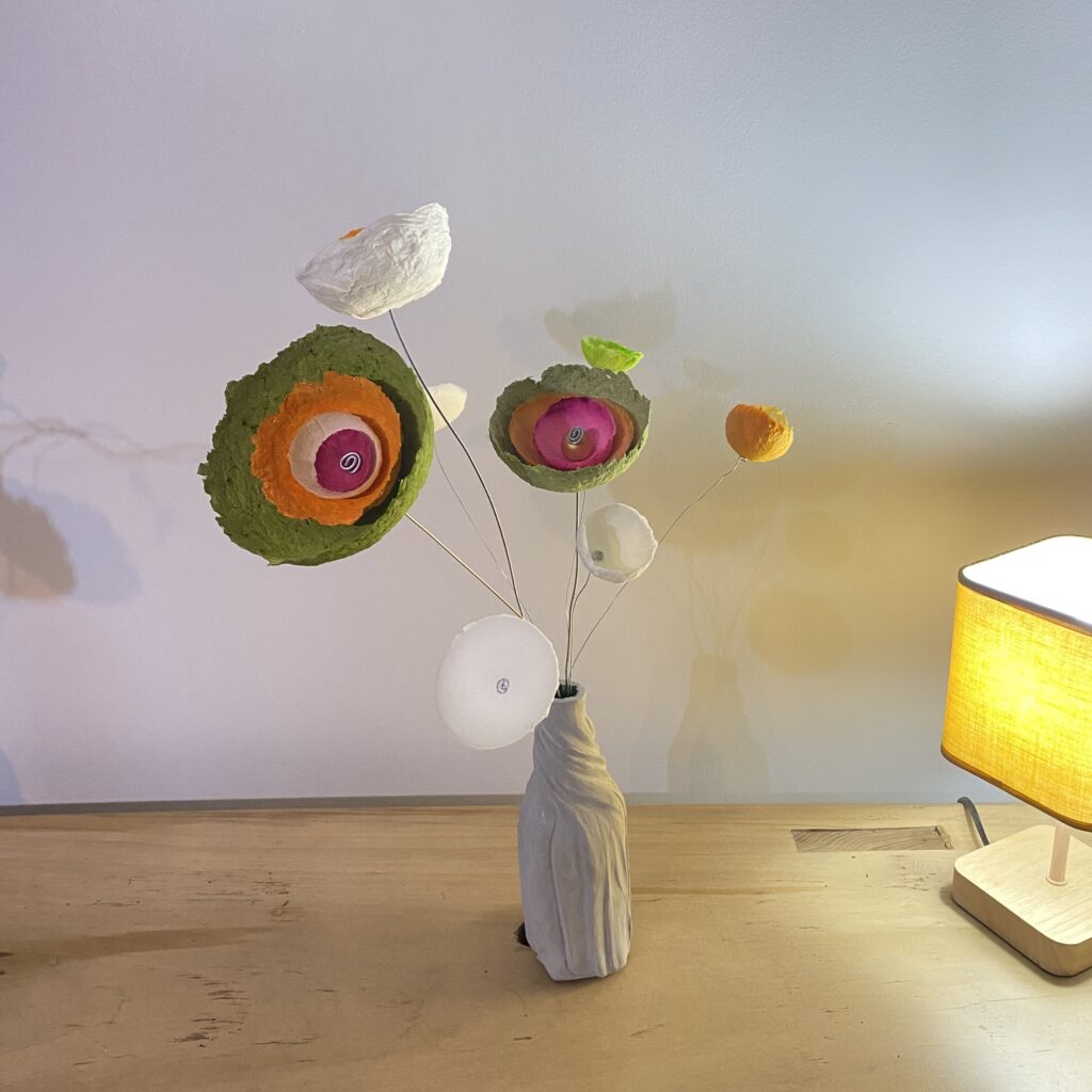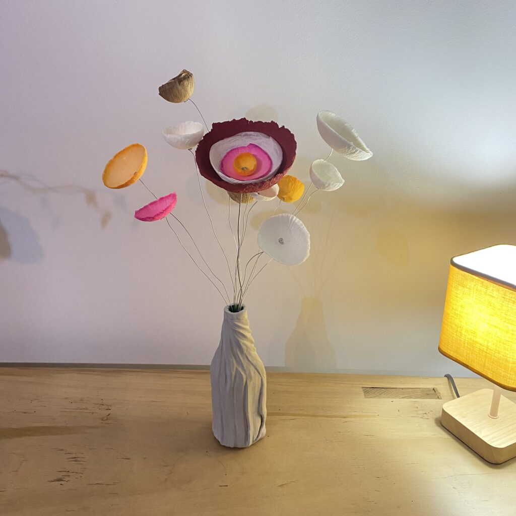 La transformation de la matière me fait vibrée et de cette énergie rayonnante est née la série des Cœurs et bouquets de fleurs. Création en papier mâché et fil de fer. Chaque cœur est unique ainsi que les fleurs faites à la main.
