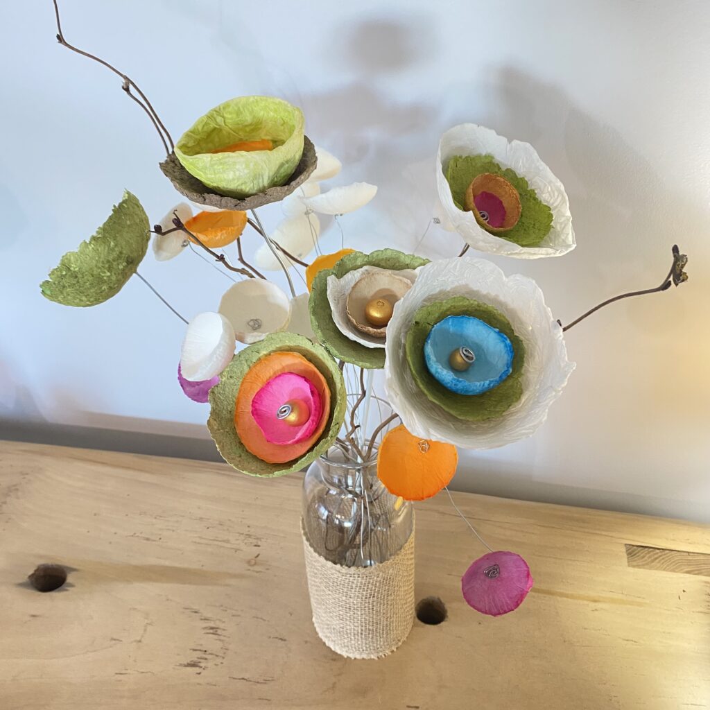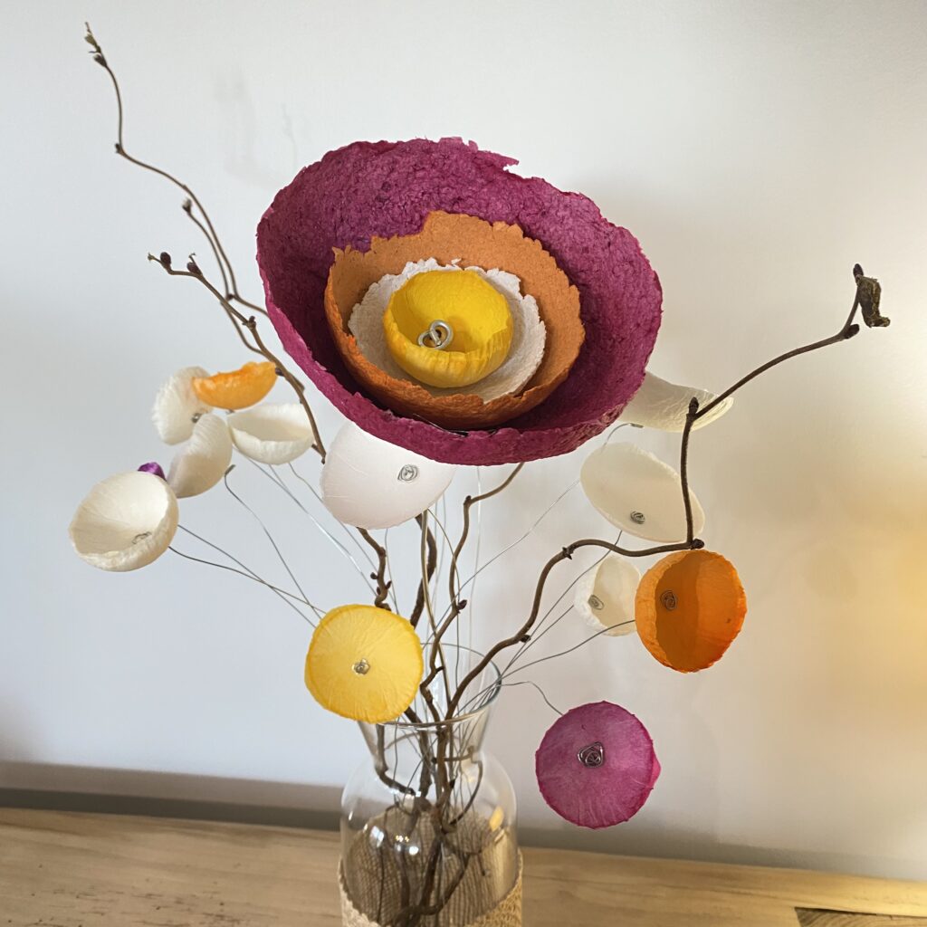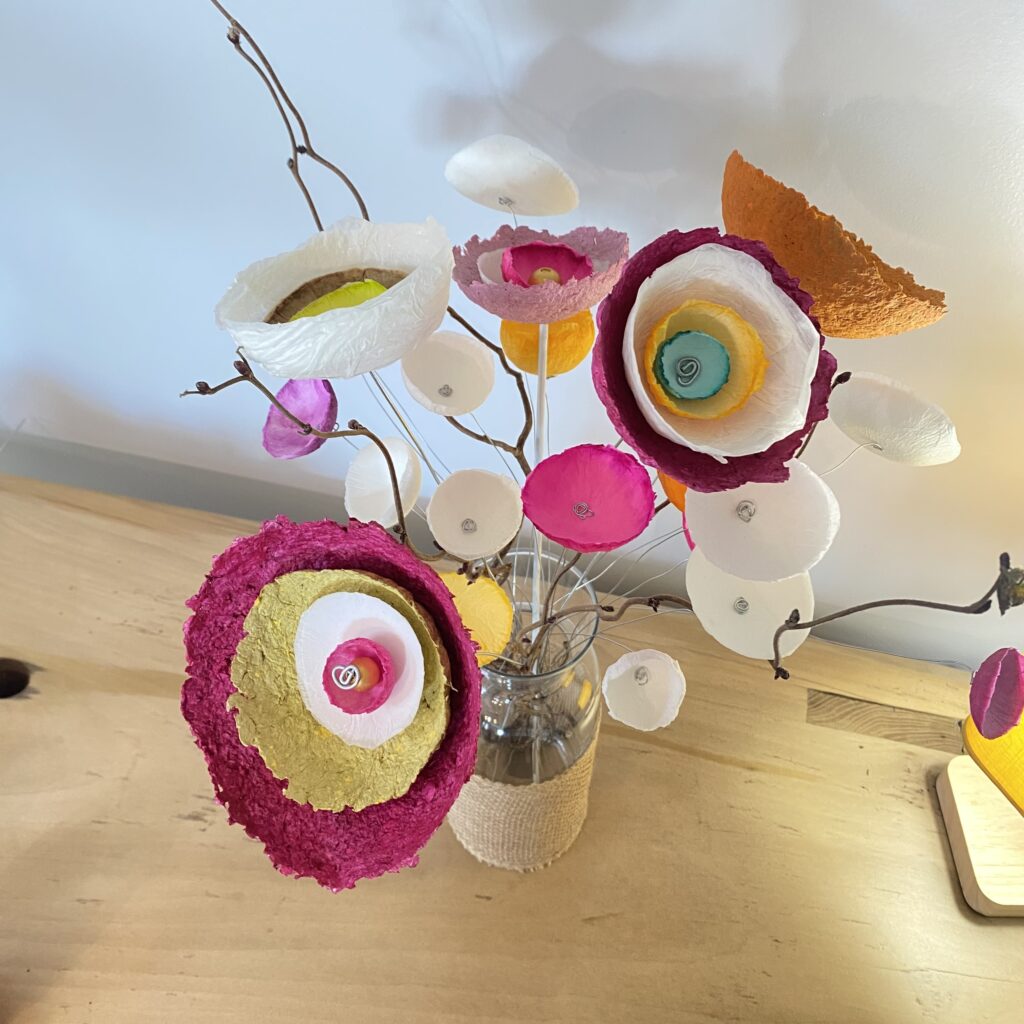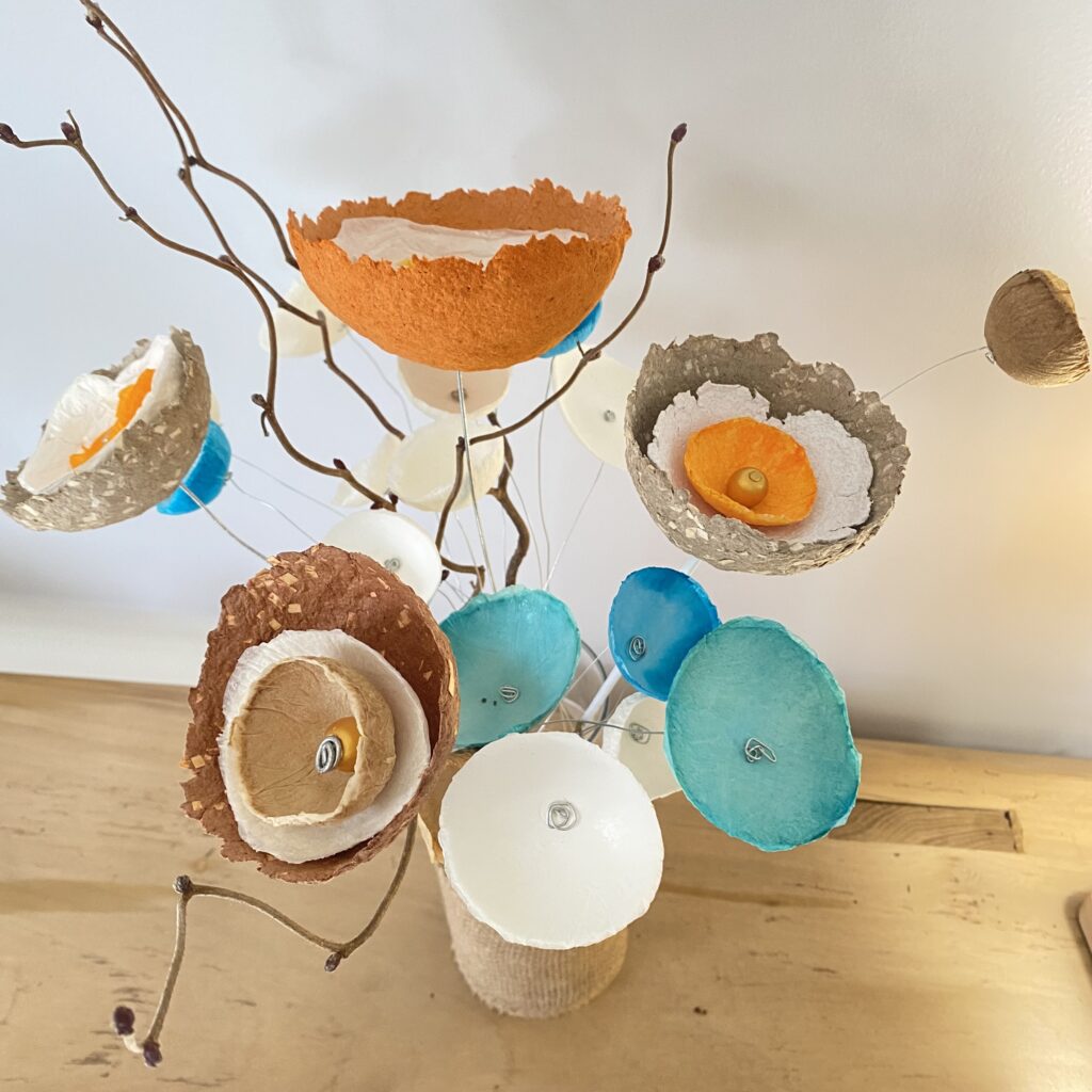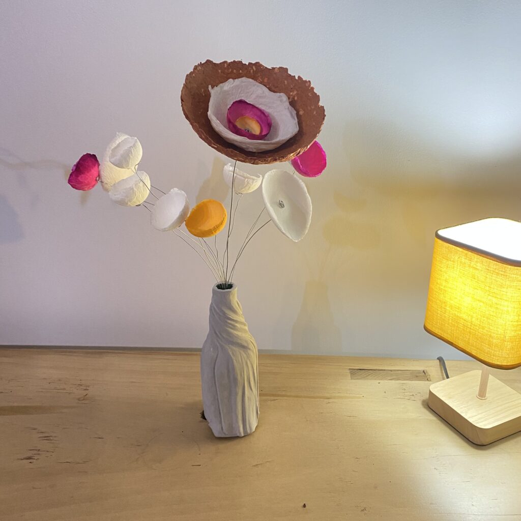 La transformation de la matière me fait vibrée et de cette énergie rayonnante est née la série des Cœurs et bouquets de fleurs. Création en papier mâché et fil de fer. Chaque cœur est unique ainsi que les fleurs faites à la main.