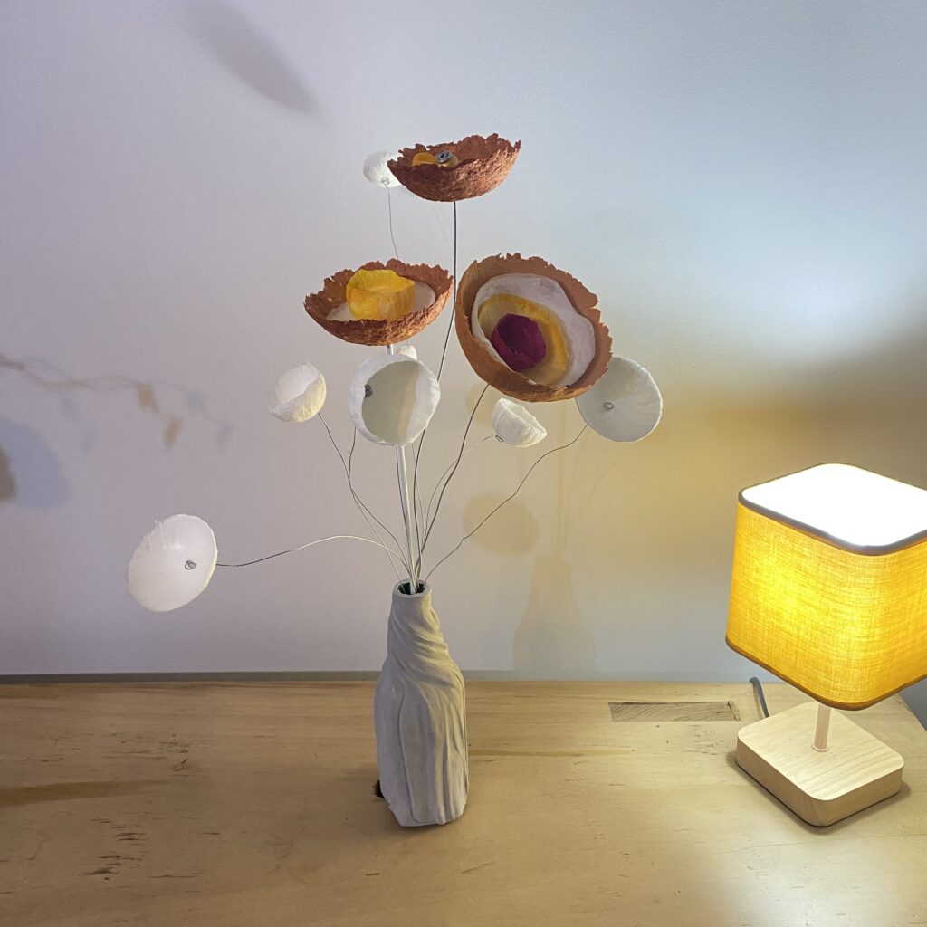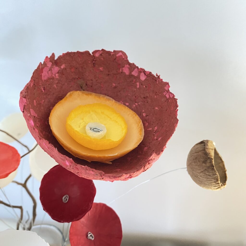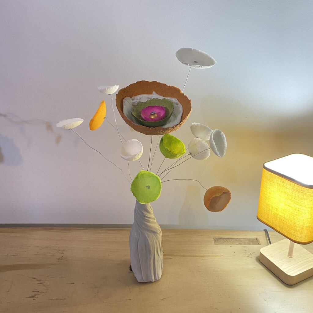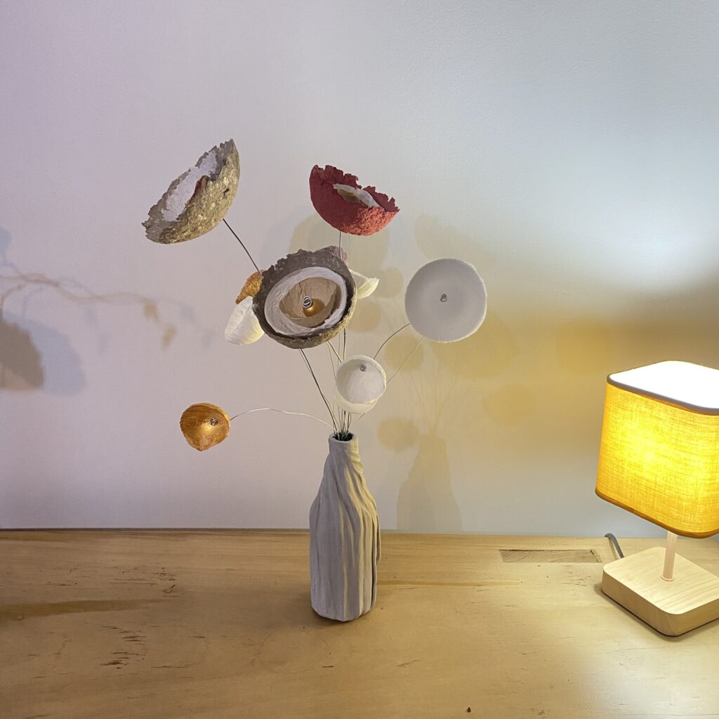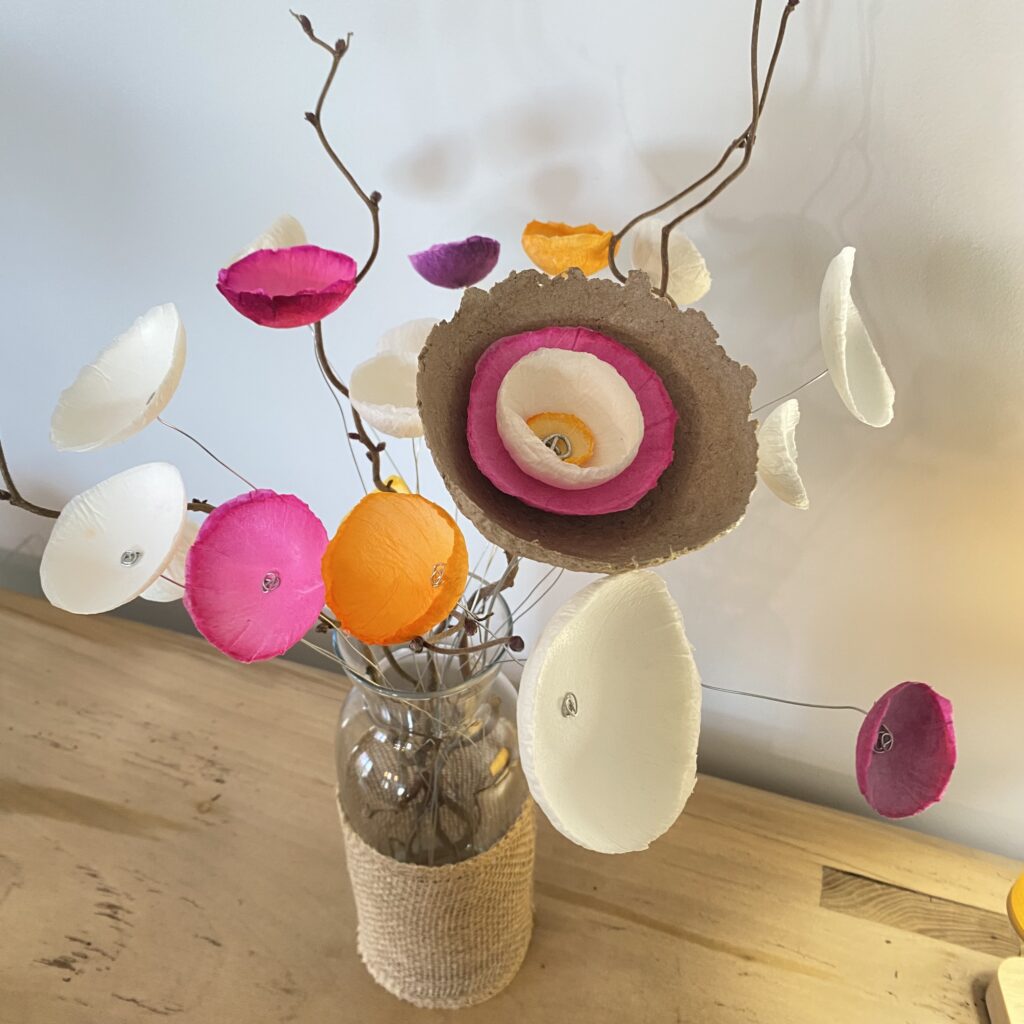 La transformation de la matière me fait vibrée et de cette énergie rayonnante est née la série des Cœurs et bouquets de fleurs. Création en papier mâché et fil de fer. Chaque cœur est unique ainsi que les fleurs faites à la main.