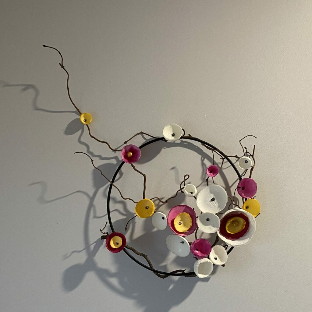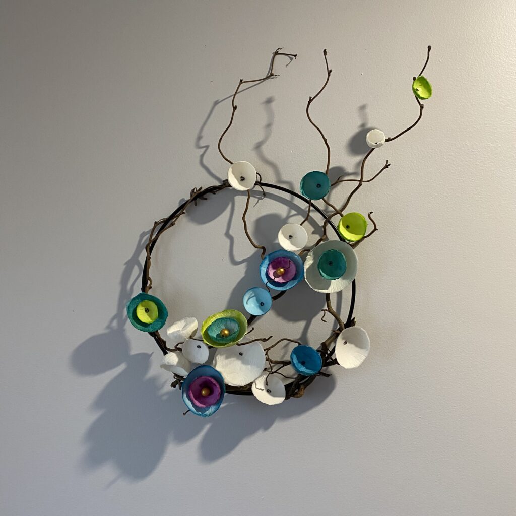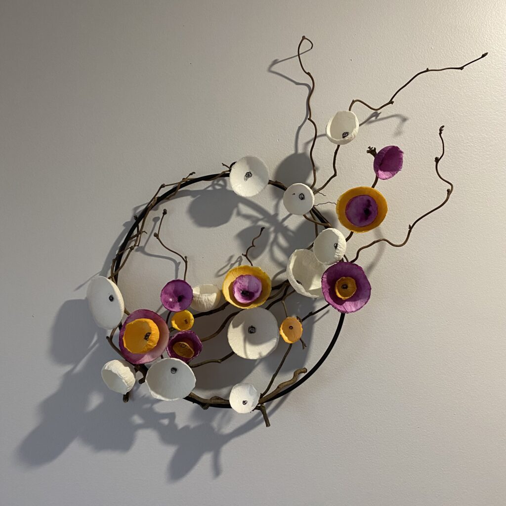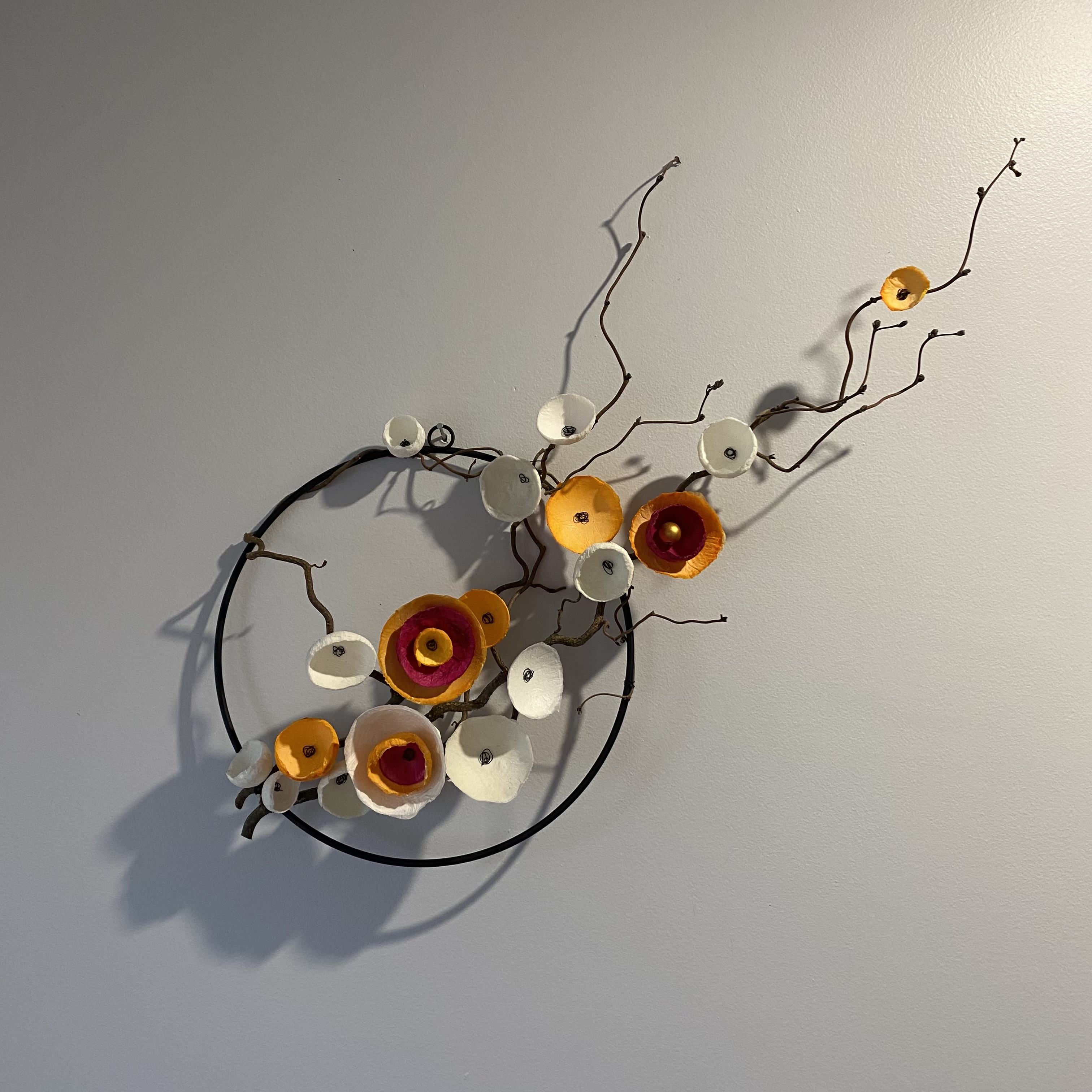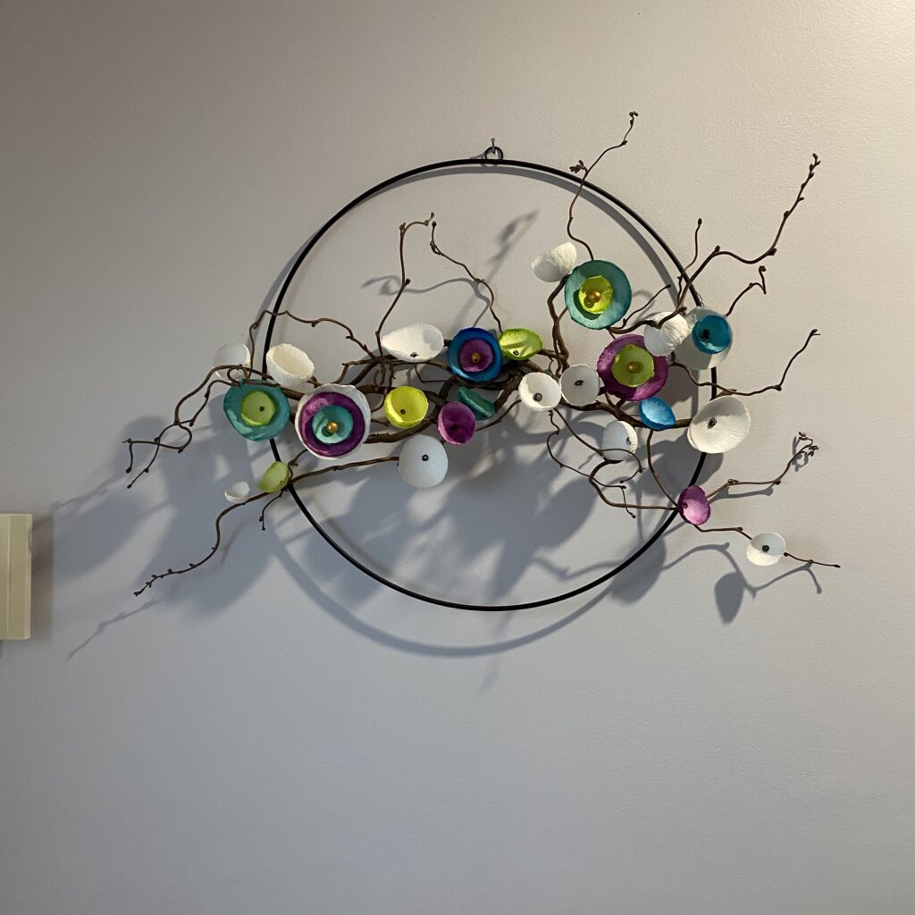 Réalisation en bois de noisetier qui danse selon son chemin, accompagnée de fleurs de papiers mâchés faites à la main sur son anneau de fer.