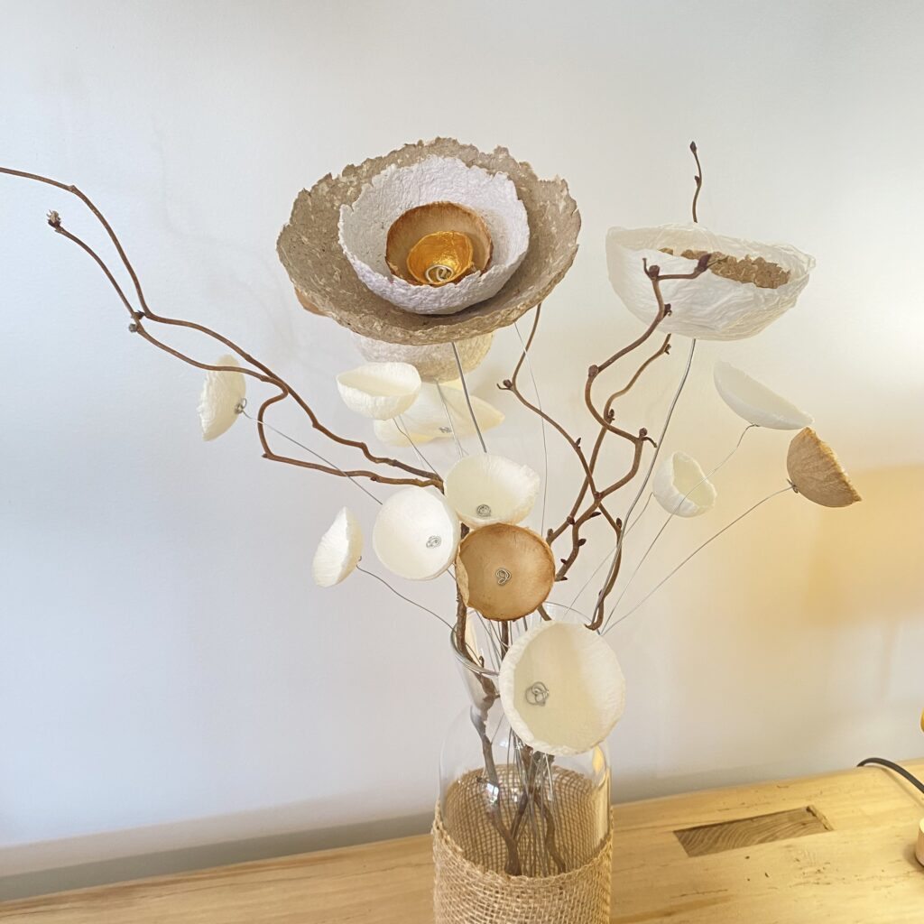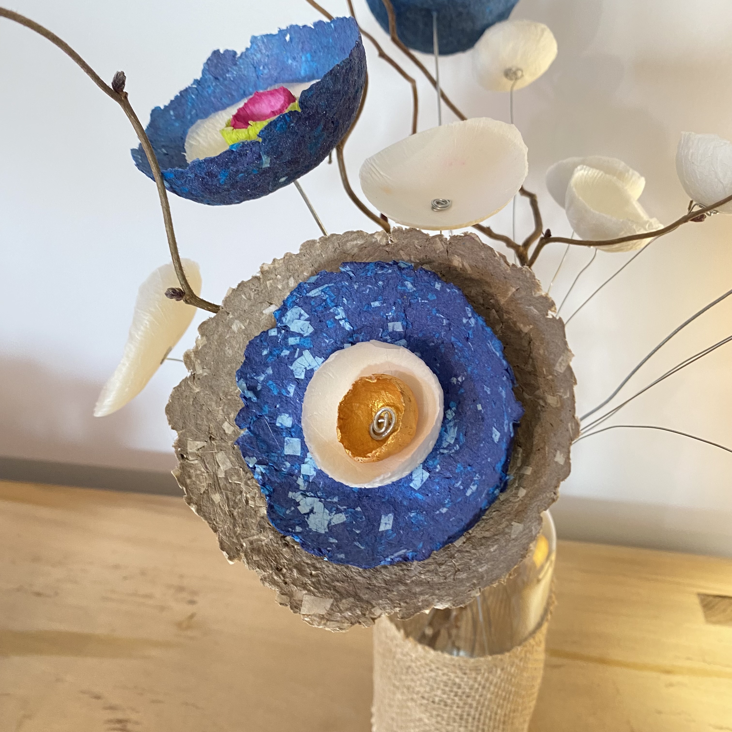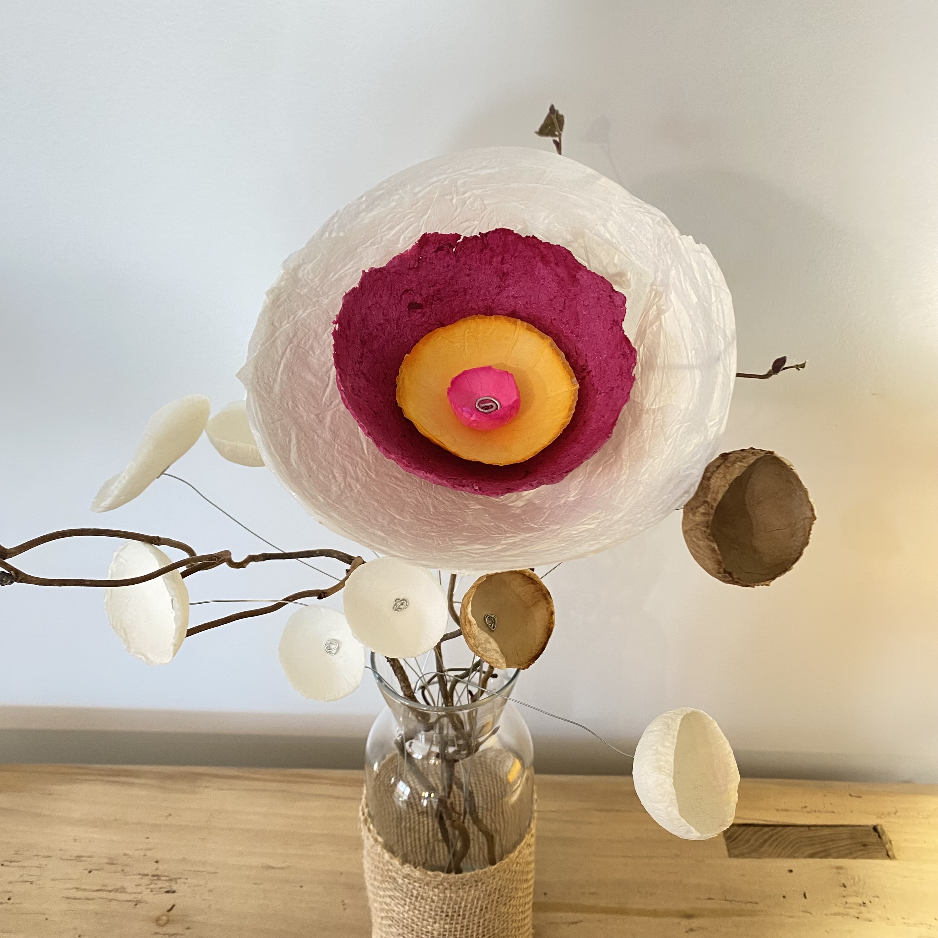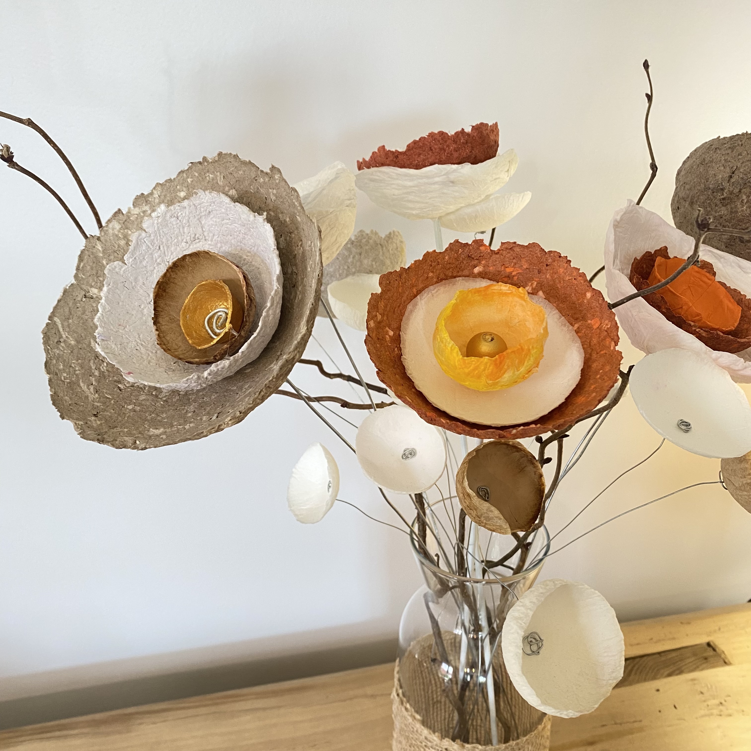 La transformation de la matière me met en joie ce qui se retrouve dans la réalisation de mes fleurs en pâte à mâché. S’élevant sur une tige de bois ou un long fil de fer, elle danse dans l’espace qui lui est offert.