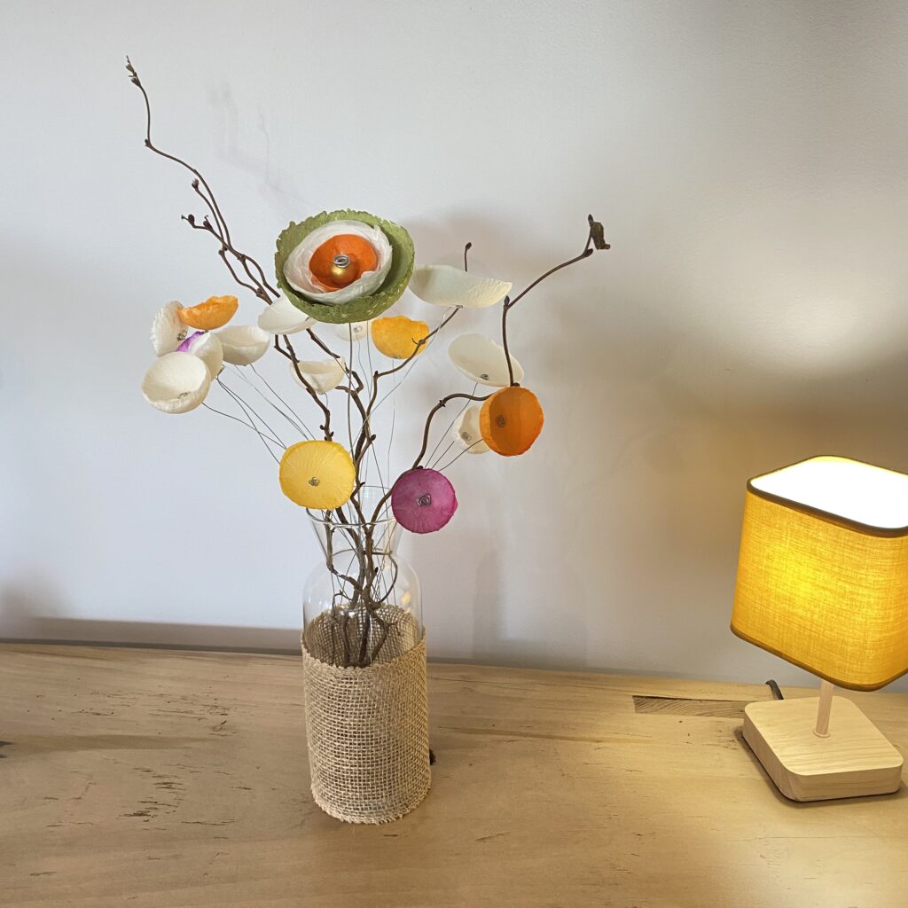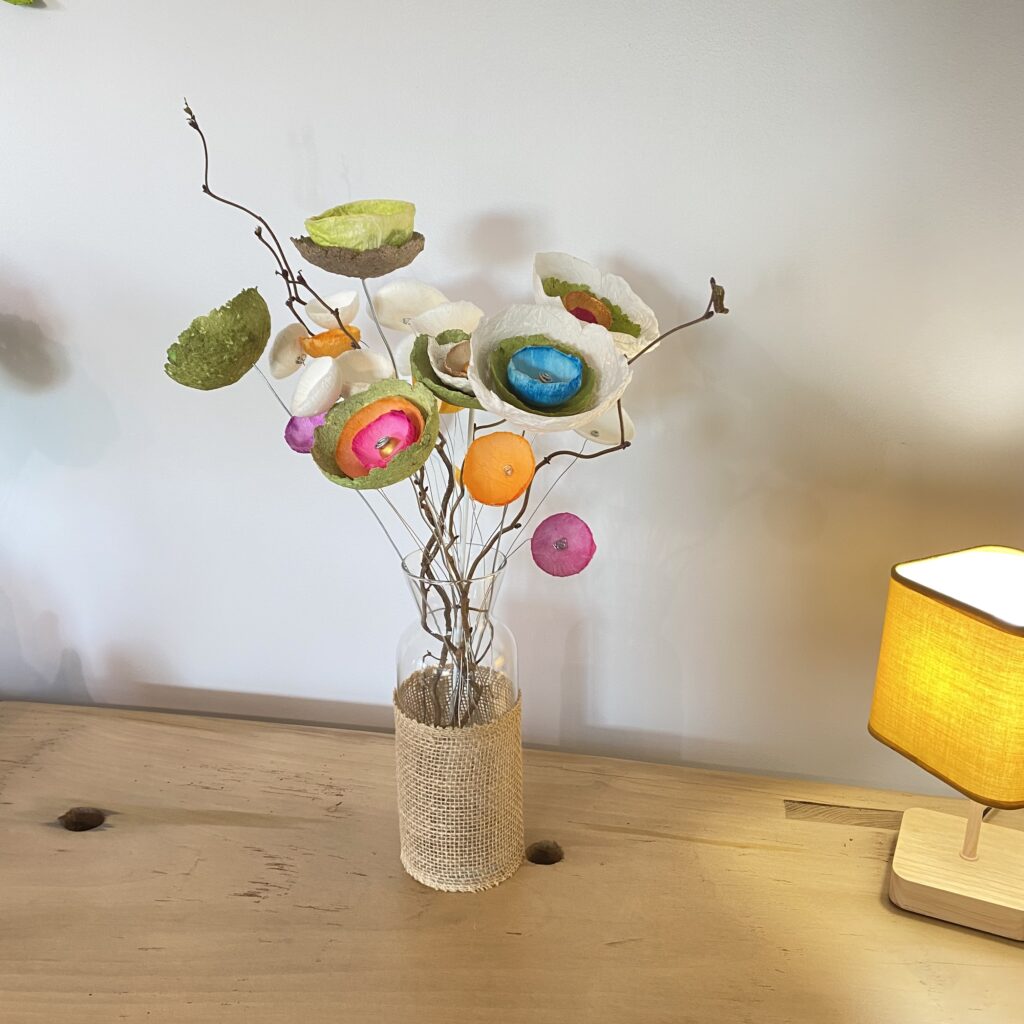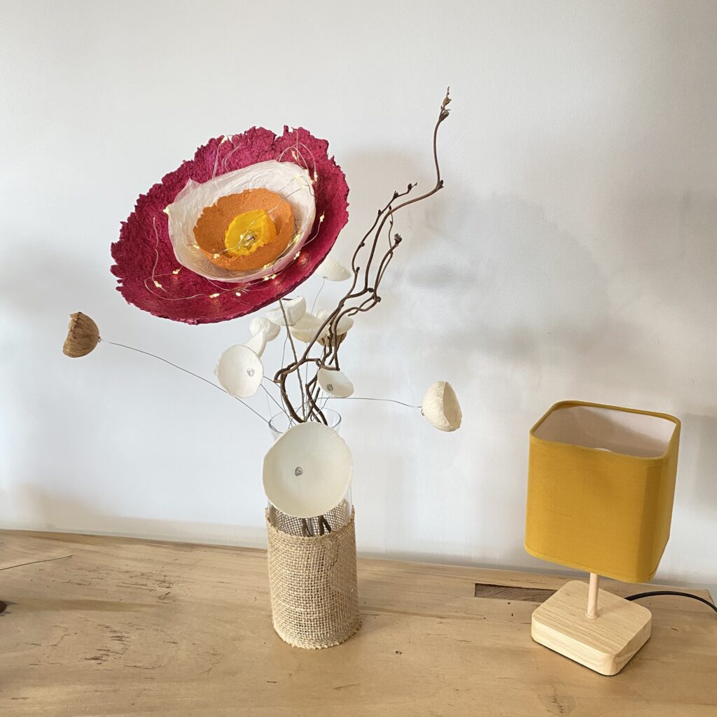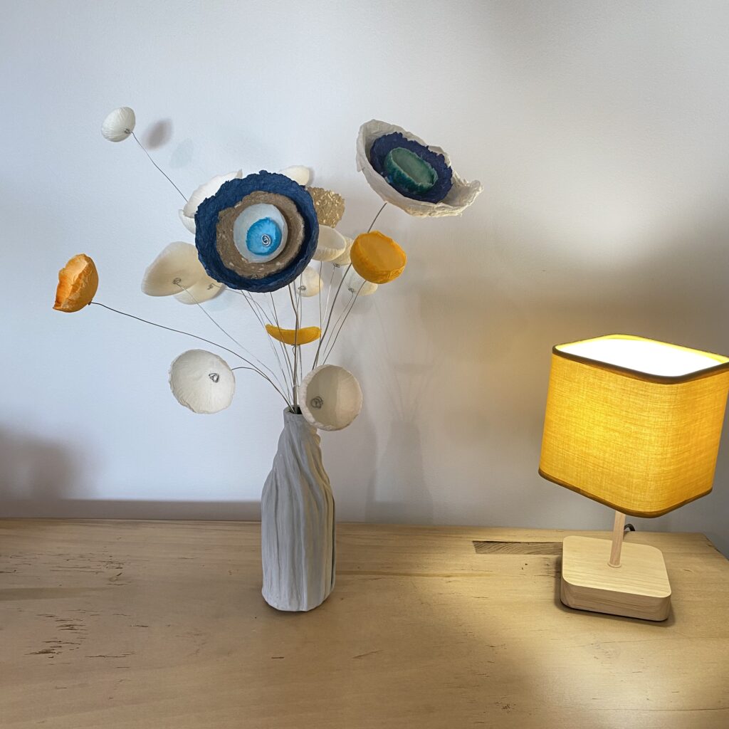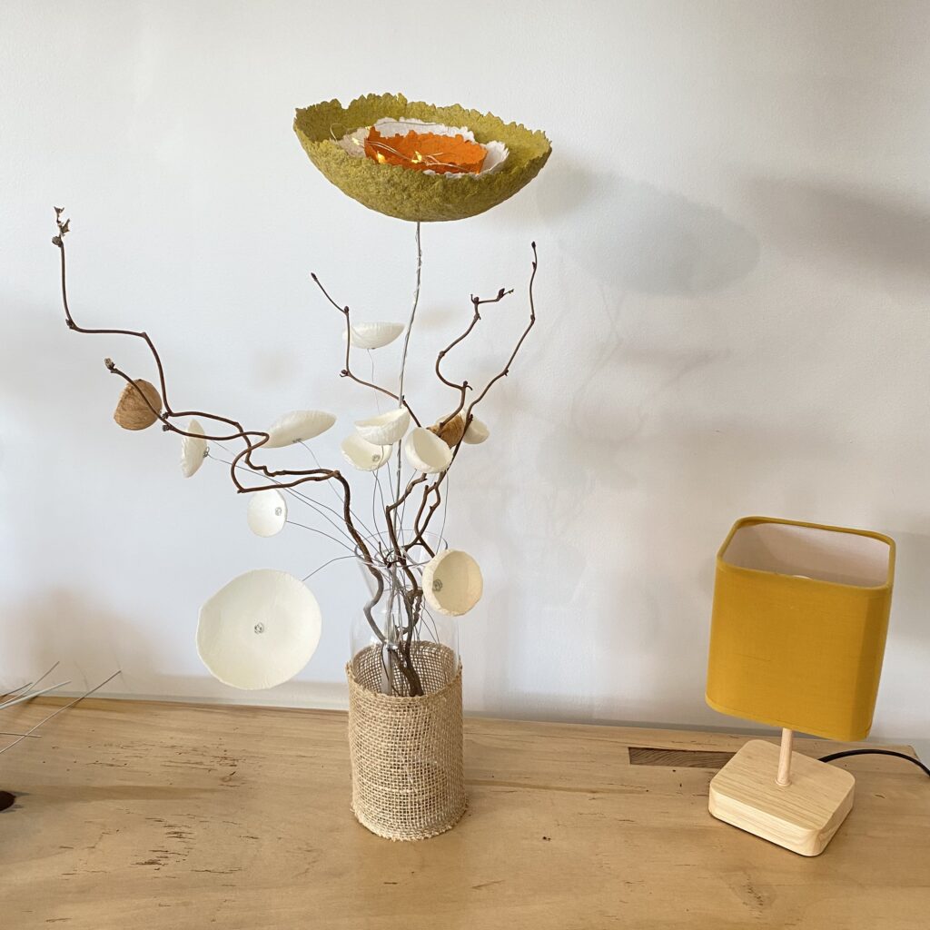 La transformation de la matière me met en joie ce qui se retrouve dans la réalisation de mes fleurs en pâte à mâché. S’élevant sur une tige de bois ou un long fil de fer, elle danse dans l’espace qui lui est offert.